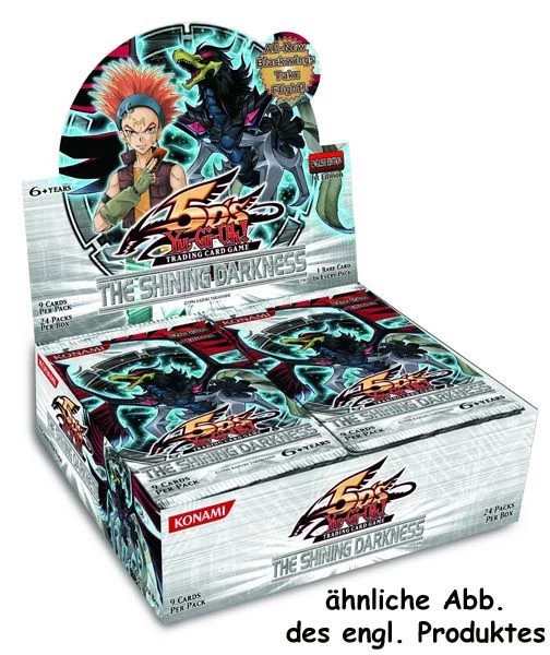Booster-Display mit Sammelkarten der Yu-Gi-Oh! Serie Shining Darkness in Deutsch. Das Display enthält 24 Booster a 9 Karten. Features der Serie Shining Darkness: 48 Common-Karten, 20 Rare-Karten, 14 Super Rare-Karten, 10 Ultra Rare-Karten und 8 Secret Rare-Karten.