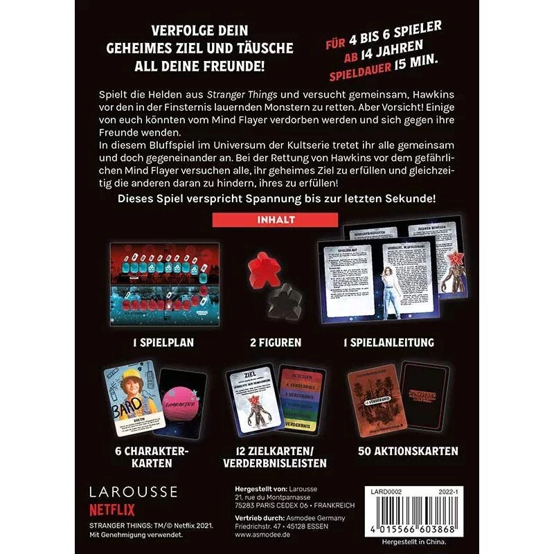 Larousse bringt mit Stranger Things: Rettet Hawkins ein spannendes Spiel zur weltberühmten Serie heraus. Stranger Things: Rettet Hawkins ist ein Bluffspiel mit geheimen Identitäten im Universum der erfolgreichen Netflix-Kultserie. Die Spieler schlüpfen in die Rollen der Serien-Protagonisten und arbeiten gemeinsam daran, Hawkins vor dem Angriff des Mind Flayers zu schützen. Allerdings verfolgen alle auch noch geheime Ziele und versuchen die anderen Spieler daran zu hindern, ihres zu erfüllen. Das kurzweilige Spiel verspricht Spannung bis zur letzten Minute!