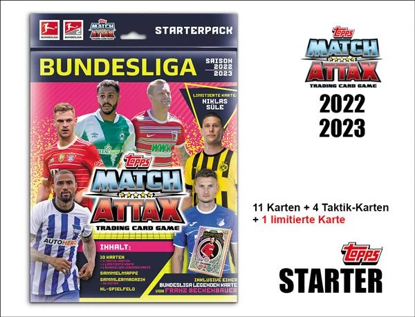 Match Attax Bundesliga 2022/2023 Starterpack in Deutsch. Inhalt: Sammelmappe + Sammler-Magazin + Spielfeld + Checkliste + 11 Karten + 4 Taktik-Karten + 1 limitierte Karte Besonderheit: Mit garantierter limitierter Karte von Niklas Süle! Mit garantierter Legenden-Karte von Franz Beckenbauer.